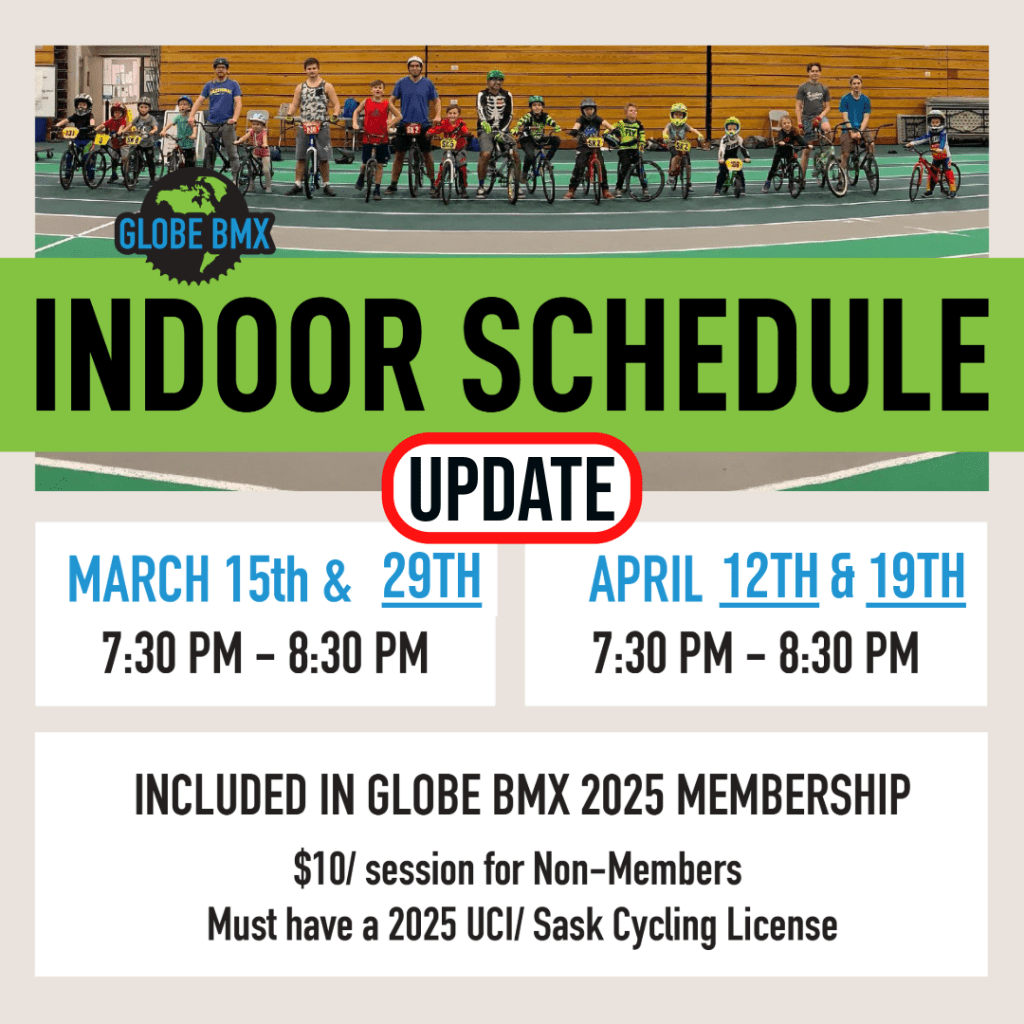 As in past seasons, we’ve reserved private track lane space indoors at the Saskatoon Field House to keep the legs moving and the dust off the race bikes. 2025 dates for indoor riding are March 15th & 29th and April 12th & 19th from 7:30 PM – 8:30 PM.