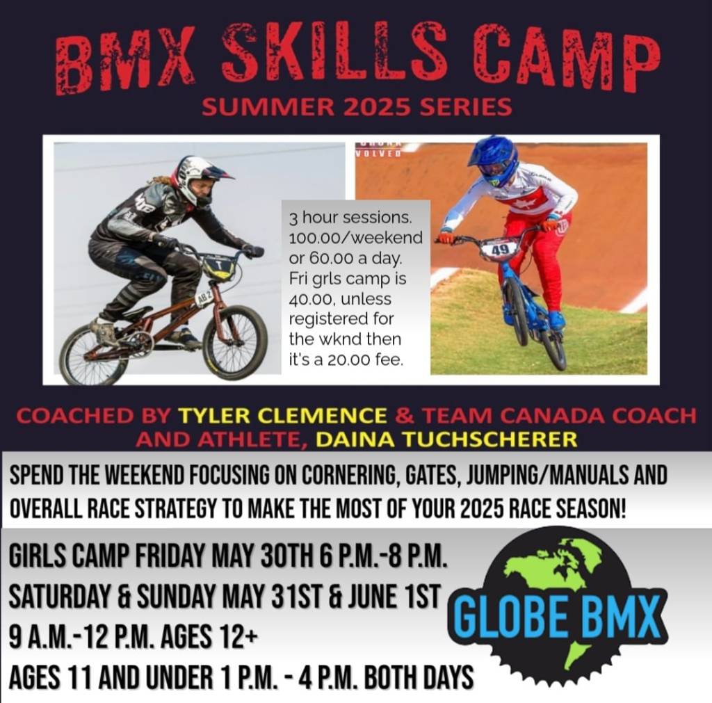 - Globe BMX members will have priority booking until May 21st. If spots are available (and they likely will be) registration will open to all SK club riders and out of province BMX riders. *If attending from out of province you must have a UCI license.